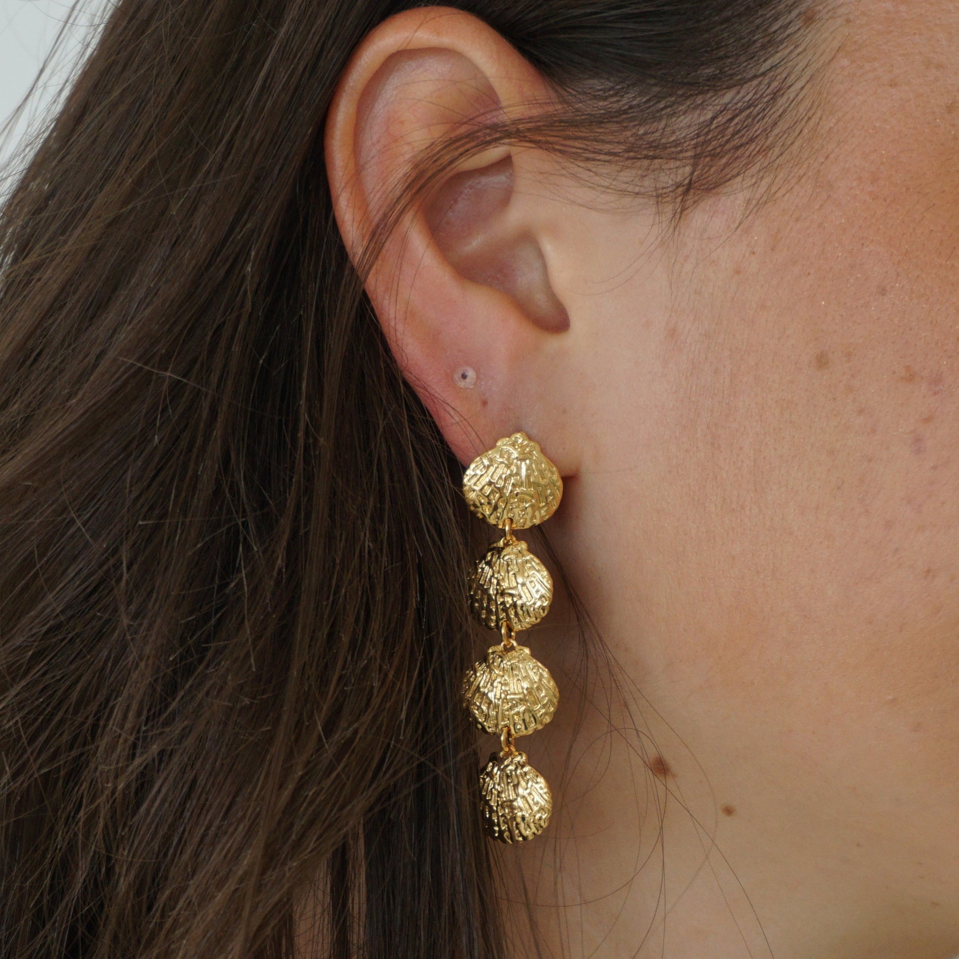 Channel oceanic charm with these cascading seashell earrings, designed to bring a touch of the sea to your style. They are perfect for adding a playful yet elegant touch to beachy or evening outfits.