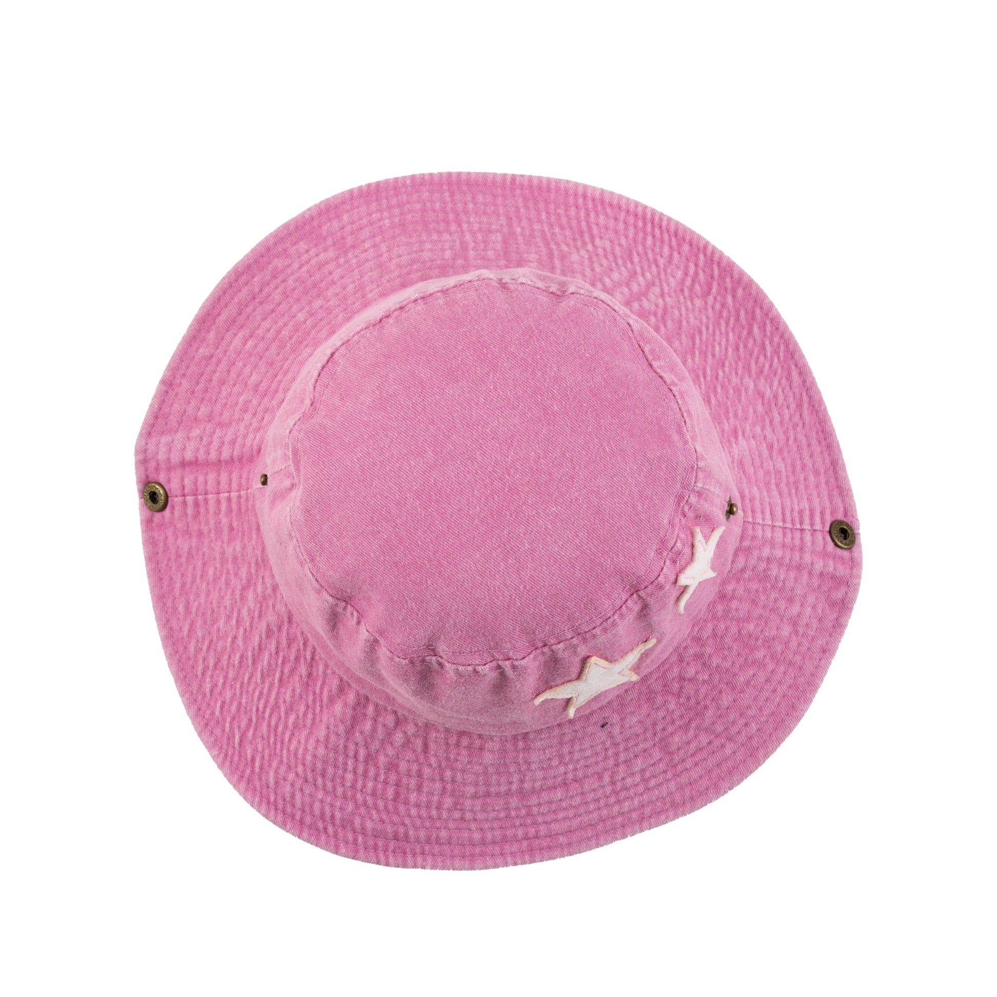 Be a star with our Star Bucket Hat! Featuring washed pink colour with two white stars on the front/left, this hat is perfect for making a fashion statement. Plus, an adjustable string under the chin ensures a comfortable and secure fit.